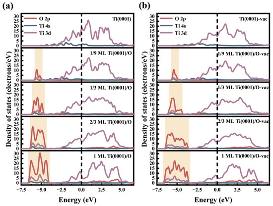 Figure 11 presents the partial densities of states (PDOSs) for both the Ti(0001)/O and Ti(0001)/O-vac surfaces at coverages of 1/9, 1/3, 2/3, and 1 monolayer (ML). Compared with the clean surface, as highlighted in the orange transparent area in Figure 11a,b, the overlapping of peaks in the O 2p and Ti 3d orbitals on both the Ti(0001)/O and Ti(0001)/O-vac surfaces indicated the formation of Ti-O bonds. This suggested that electron transfer between O and Ti atoms resulted in hybridization of O 2p and Ti 3d orbitals. As the θ increased from 1/9 to 1 ML, the number of peaks in the O 2p and Ti 3d orbitals increased, and the overlapping regions became broader, indicating an enhancement in hybridization and the formation of stronger Ti-O bonds. At higher θ (θ = 2/3 and 1 ML), in comparison with the Ti(0001)/O surface (see Figure 11a), there was an increase in the number of O 2p and Ti 3d orbital peaks on the Ti(0001)/O-vac surface, accompanied by a widening of the overlapping area (see Figure 11b). This suggested that the presence of Ti vacancies intensified hybridization, thereby reinforcing the Ti-O bond. These observations were in line with the results obtained from the overlap population analysis.