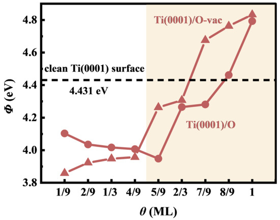 The work function (Φ) of both the Ti(0001)/O and Ti(0001)/O-vac surfaces is presented in Figure 12. It is noteworthy that the calculated Φ of the clean surface was 4.431 eV, a value consistent with previously reported theoretical and experimental findings in Table 1. A higher Φ indicated greater stability of surface electrons [35]. At low θ (), the variation in Φ on both the Ti(0001)/O and Ti(0001)/O-vac surfaces was minimal. However, as depicted in the orange transparent area, Φ experienced a sudden increase at higher θ () on both surfaces, with the Φ of the Ti(0001)/O-vac surface surpassing that of the Ti(0001)/O surface. These results suggested that the inhibitory effect of O adsorption on the escape of surface electrons positively correlated with the quantity of adsorbed O atoms, and the presence of the Ti vacancy significantly impeded the escape of surface electrons from the Ti(0001)/O surface.