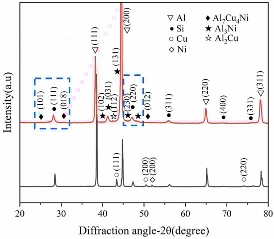 In previous work [], a PBF-LB/M Al-Si-Cu-Ni alloy has been manufactured by using optimal process parameters (laser powder—290 W, scanning speed—1000 mm/s, layer thickness—30 μm, hatch distance—40 μm, scanning strategy—stripes) (specific compositions of the alloy powders used are shown in Table 1 and will not be described here).