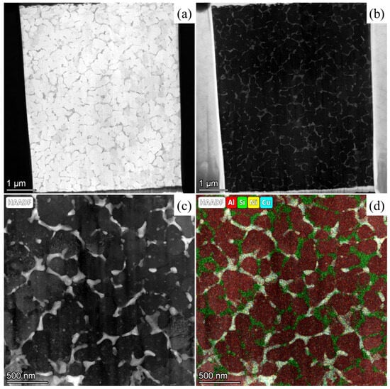 TEM images of microstructural characteristics on the top surface of PBF-LB/M Al-Si-Cu-Ni samples: (a) bright-field image; (b) dark-field image; (c) HAADF morphology; (d) EDS mapping element distribution.