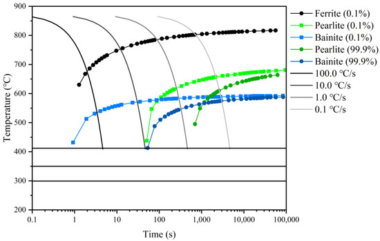 In this study, the steels designed for wind power application with yield strengths of 500 MPa were used. This material features a thickness of 25 mm and was processed using the thermo-mechanical controlled process (TMCP). This composition adheres to a low-carbon plus micro-alloying philosophy, incorporating trace amounts of niobium (Nb) and titanium (Ti), consistent with a targeted alloy design system for enhanced material properties. The detailed chemical composition of the steel is presented in Table 1. The Ac1 and Ac3 temperatures of Q500 MPa grade wind power steel were calculated using JMatPro software (v12.1). As shown in Figure 1, the Ac1 temperature was determined to be 693 °C, while the Ac3 temperature was found to be 824 °C.