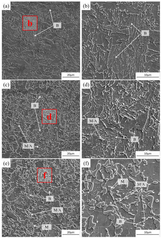 SEM images of microstructure in simulated CGHAZs: (a,b) Steel 1, (c,d) Steel 2 and (e,f) Steel 3.