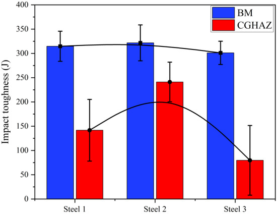 Low-temperature impact toughness of BM and CGHAZ of three steels.
