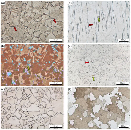 Micrographs of all investigated materials. (a) Alloy25. Arrow: Gamma phase. (b) PerforMet®. Arrow: Ni2Si (nickel silicide). (c) ToughMet® 3. (d) AISI 321. Red arrow: delta ferrite, green arrow: TiN (titanium nitride). (e) IN 625. Red arrow: annealing twins, green arrow: TiN. (f) 1.4511.
