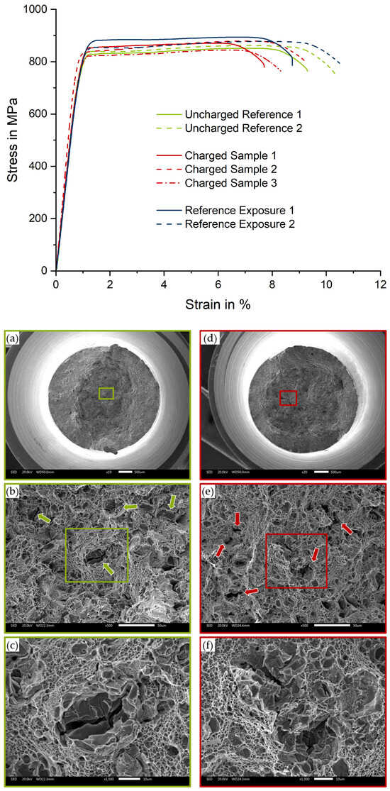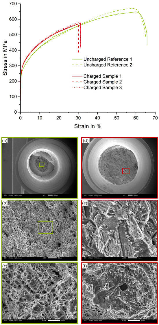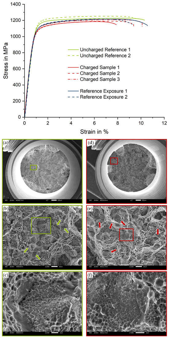 Fractography of the uncharged reference samples revealed a transgranular fracture pattern with an overall ductile dimple fracture type (a–c). In accordance with the material’s chemical composition, there are several Ni- and Si-rich precipitations of type Ni2Si (nickel silicide) present. The fractographic investigation of the charged sample (d–f) did not reveal hydrogen-induced fracture patterns. The fracture appearance does not differ from the uncharged sample. Interfaces of Ni2Si precipitates could act as local fracture initiation sites due to their trapping behavior and the related increased local hydrogen content. However, none of the Ni2Si precipitates distinctly initiated failure.