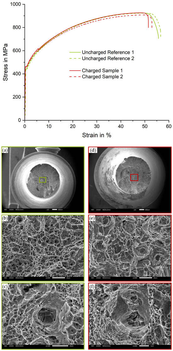The results of all SSRT alongside with fractographic investigations of each reference sample and hydrogen-charged sample are shown in Figure 4, Figure 5, Figure 6, Figure 7, Figure 8 and Figure 9.
