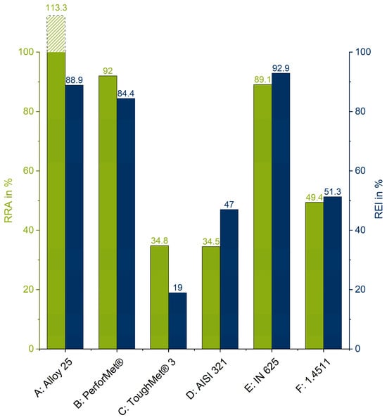 The highest values for RRA and REl and therefore the best resistance to hydrogen embrittlement were found for high-strength Cu alloy Alloy 25 (material A). For this alloy, the calculated value for RRA (theoretically) exceeds 100% which corresponds to no HE effects whatsoever, but rather represents statistic deviations of the mechanical properties. The slightly reduced REl is caused by a single outlier sample. These findings are in accordance with the low hydrogen content within the charged samples (0.02 ppm) and the fracture surfaces which revealed hardly any difference between the hydrogen-free and hydrogen-charged samples in terms of fracture morphology.