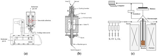 Numerous studies globally have explored the use of hydrogen as a reducing agent. This article specifically focuses on laboratory research concerning the reduction of Fe-based metal-bearing materials, aiming to gather extensive information about the materials under investigation, furnace equipment, reduction conditions, and the influence of various parameters on the reduction process and the properties of the resulting products. Typically, laboratory experiments have concentrated on reducing ores, pellets, and synthetic powders. The sizes of the samples and their grain sizes largely depended on the capabilities of the experimental equipment available. Different methodologies were employed for the reduction in each type of material using hydrogen, reflecting the lack of a unified, standardized approach globally. Most experimental setups are characterized by unique, original methodologies developed by the researchers, tailored to the specific nature of the samples and the reduction parameters being monitored. Commonly used methodologies include those based on TGA (thermogravimetric) devices, fluidized beds, and reduction retorts, which rigorously monitor gaseous components, as shown in Figure 2 [33,34,35]. Another potential apparatus for reducing Fe materials with hydrogen is a rotary kiln. However, reports on the use of rotary kilns for the gaseous reduction of iron oxide are scarce, with this method occupying a niche between fixed bed and fluidized bed reactors [36].