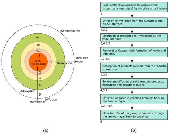 A reduction model showing the development of the reduction reaction of iron oxides with hydrogen; (b) Process steps in the reduction of iron oxides with hydrogen. The location of the process steps is shown by numbers 1 to 5 (b), which are also shown in the reduction model (a) Adapted from Ref. [71].