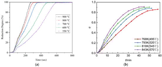 Effect of temperature on the rate of reduction: (a) of hematite powder at temperatures above 550 °C Adapted from Ref. [67]; (b) of magnetite ore at temperatures below 570 °C. Reprinted with permission from ref. [54]. 2024 Elsevier.
