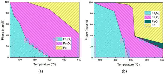 The reduction in iron oxides is a gradual process that significantly depends on temperature [65,66]. This thermodynamic behavior can be effectively visualized using a Baur–Glässner diagram, as depicted in Figure 3. The diagram illustrates the stable regions for different phases of iron oxides based on temperature and the degree of gas oxidation. The degree of gas oxidation is defined as the ratio of the oxidized components in the gas to the sum of oxidized and reducible gas components. From Figure 3, it is evident that the zone of stable iron expands with an increase in temperature when hydrogen is employed as the reducing agent. This observation suggests that higher temperatures enhance the efficiency of hydrogen in the reduction process. Conversely, the reduction behavior of iron oxides using the reducing gas CO exhibits an opposite trend, where lower temperatures may be more favorable [15].
