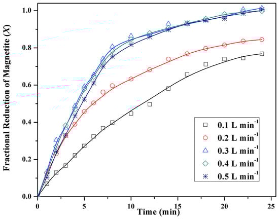 In laboratory experiments, researchers have specifically studied the influence of hydrogen flow rates on the reduction process. Kulia et al. explored the impact of various hydrogen flow rates (0.1, 0.2, 0.3, 0.4, and 0.5 L/min) on the reduction in magnetite ore at 900 °C and 1 atm pressure. Their findings indicated that increasing the hydrogen flow from 0.1 to 0.4 L/min enhanced the degree of reduction, as shown in Figure 8. However, flow rates above 0.4 L/min did not significantly improve the reduction outcomes, leading to the determination that 0.4 L/min is the optimal hydrogen flow rate for this process [44]. Kang et al. noted that there is a critical point at which changes in the flow rate of the reducing gas primarily affect the concentration of the gas at the reaction interface. Once the hydrogen flow rate exceeds this critical threshold, it indirectly influences the reaction rate by modulating the hydrogen concentration at the interface. Consequently, any further increase in flow rate beyond this point does not enhance the degree of reduction, indicating that the relationship between flow rate and reduction efficiency is not linear [81].