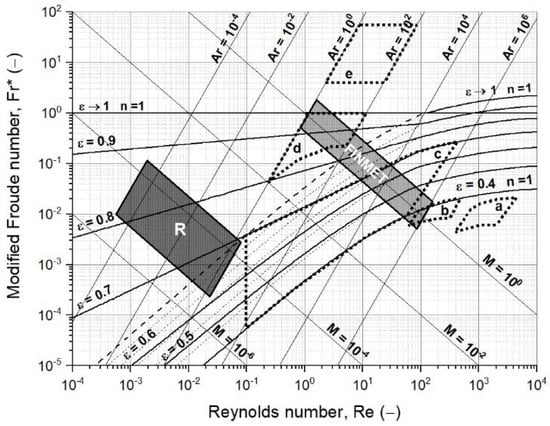Figure 9 displays an extended version of the Reh diagram, which includes various gas–solid reactor systems (fields a to e), the FINMET operating field, and the operating field R for the reduction of iron ore ultra-fines in a fluidized bed. The operating field R is described as follows: