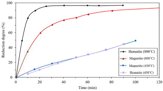 The influence of the composition of the reduced materials was examined by Edstrom et al., who compared the hydrogen reduction of hematite and magnetite. As illustrated in Figure 10, the reduction of hematite by hydrogen occurs faster than that of magnetite, particularly at higher temperatures. This difference is attributed to the hard and dense shell of magnetite, which impedes diffusivity [67]. Additionally, the higher density of hematite (5.260 g/cm3) compared to magnetite (5.175 g/cm3) means that the reduction in hematite to magnetite involves volume changes that lead to microcracking. These cracks act as pores and enhance gas diffusion [67].