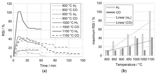 The ratio of hydrogen to carbon monoxide in the reducing gas plays a crucial role in controlling the reduction rate. Thermodynamic calculations indicate that CO has greater reducing power at lower temperatures, whereas hydrogen reduction is more stable thermodynamically at higher temperatures. From a kinetic perspective, hydrogen atoms, due to their smaller size and higher diffusivity, act as a faster reducing agent than CO at temperatures above 850 °C. Thus, both thermodynamically and kinetically, increasing the temperature enhances the reduction of iron oxides with hydrogen [67].
