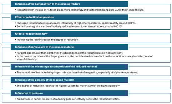Additionally, the reduction reaction of hydrogen is influenced by dynamic conditions. Factors that affect the reduction rate include temperature, pressure, gas composition, grain size, the porosity of iron oxide, and the mineralogy of the iron oxide [15,68,69]. These elements must be optimally managed to improve the efficiency and speed of the reduction process.