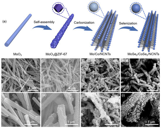 (a) Schematic illustration of the synthesis of the MoSe2/CoSe2/NCNTs, SEM images of (b,c) MoO3, (d,e) MoO3@ZIF-67, (f,g) Mo/Co/NCNTs, and (h,i) MoSe2/CoSe2/NCNTs.