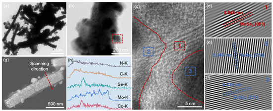 Microstructure analysis of MoSe2/CoSe2/NCNTs: (a,b) TEM images (red dashed square: the enlarged area is shown in Figure 2c), (c) HRTEM image (red dashed line is the heterointerface between MoSe2 and CoSe2), (d–f) inverse-FFT images of regions 1, 2, and 3, (g) HAADF image, and (h) EDX line profile.