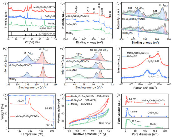 Structural characterization of the MoSe2/CoSe2/NCNTs, CoSe2/NC, and MoSe2: (a) XRD patterns, (b) XPS wide spectra, (c) Co 2p spectra, (d) Mo 3d spectra, (e) Se 3d spectra, (f) Raman spectra, (g) TG curve, (h) N2 adsorption–desorption isotherms, and (i) pore size distribution.