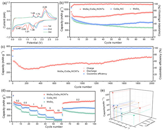 To understand the relationship between structure and electrochemical performance, the electrochemical performance of samples was first evaluated in LIBs. Figure 4a and Figure S6 present the cyclic voltammetry (CV) curves of four samples, which can be used to analyze the electrochemical reaction process of electrodes. By comparison, it can be seen that the peaks at 1.36 V and 1.01 V mainly stem from the reduction reaction of CoSe2 to metallic Co, while the peaks at 0.65 V and 0.48 V belong to the reduction reaction of MoSe2 to metallic Mo [28,29]. The peaks at 1.44 V and 1.73 V stem from the conversion of metallic Mo to MoSe2, while the peak at 2.20 corresponds to the conversion of metallic Co to CoSe2 [2,30]. As depicted in Figure S7, the initial coulombic efficiency (ICE) of MoSe2/CoSe2/NCNTs is 77%, which is higher than the ICE of MoSe2/CoSe2/NC, CoSe2/NC, and MoSe2.