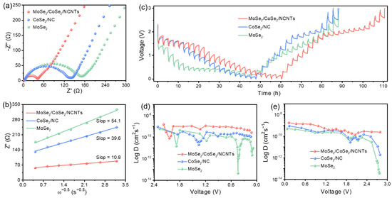 As is well known, the electrochemical performance of electrodes is closely related to the diffusion kinetics of metal ions. To comprehensively grasp the diffusion state of metal ions inside the electrodes, electrochemical impedance spectroscopy (EIS) and galvanostatic intermittent titration technique (GITT) measurements were employed to estimate metal ionic diffusion coefficients. As depicted in Figure 5a and Figure S9b, the charge transfer resistance (Rct) of MoSe2/CoSe2/NCNTs is smaller than that of the other three electrodes. The relationship between Warburg impedance coefficients and frequency can be obtained by fitting the straight lines of a Nyquist plot. Compared with MoSe2/CoSe2/NC, CoSe2/NC, and MoSe2, MoSe2/CoSe2/NCNTs also have smaller Warburg impedance coefficients, reflecting the faster ion diffusion rate (Figure 5b and Figure S9b). The GITT curves of four electrodes are exhibited in Figure 5c and Figure S11. According to calculation, the ion diffusion rate inside the bulk phase during charging/discharging can be determined (the detailed calculation process is presented in Figure S10). As demonstrated in Figure 5d,e, the Li+-ion diffusion coefficient of MoSe2/CoSe2/NCNTs fluctuates between 7.7 × 10−11 and 1.5 × 10−9 during discharging, while it fluctuates between 2.3 × 10−10 and 1.8 × 10−9 during charging. In short, no matter in discharging process or charging process, the Li+-ion diffusion coefficient of MoSe2/CoSe2/NCNTs is always higher than that of MoSe2/CoSe2/NC, CoSe2/NC, and MoSe2 (Figure 5d,e and Figure S12), which is also the root cause of why MoSe2/CoSe2/NCNTs have better rate performance.