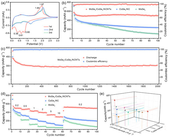 Electrochemical performances of electrodes in SIBs: (a) CV curves of MoSe2/CoSe2/NCNTs at a scan rate of 0.5 mV s−1 from 0.01 to 3.0 V, (b) cycling performances of MoSe2/CoSe2/NCNTs, CoSe2/NC, and MoSe2 at a current density of 0.2 A g−1, (c) cycling performance of MoSe2/CoSe2/NCNTs at a current density of 5 A g−1, (d) rate performances of MoSe2/CoSe2/NCNTs, CoSe2/NC, and MoSe2 at different current densities of 0.2–10 A g−1, and (e) comparison of performances between MoSe2/CoSe2/NCNTs and the previously reported literature (Pentagram represents this work, others adapted from Refs. [2,3,4,28,29,30,31,32,33]).