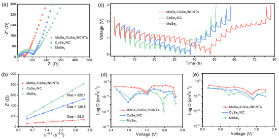 To explore the origin of excellent Na+-ion storage performance, EIS measurement was employed to investigate the Na+-ion transport rate. Figure 7a and Figure S15a show the Nyquist plots of four electrodes after 100 cycles. The charge transfer resistance of MoSe2/CoSe2/NCNTs is the smallest, followed by MoSe2/CoSe2/NC and CoSe2/NC, while that of MoSe2 is the highest. This indicates that the carbon matrix plays a crucial role in reducing charge transfer resistance, especially highly graphitized carbon materials, which can achieve better results. The fitting results of the straight line in the Nyquist plot also demonstrate that MoSe2/CoSe2/NCNTs have the smallest Warburg impedance coefficient compared to MoSe2/CoSe2/NC, CoSe2/NC, and MoSe2 (Figure 7b and Figure S15b). The diffusion coefficient of Na+ ion is inversely proportional to the Warburg impedance coefficient [39,40], indicating that the diffusion rate of Na+ ion in the bulk phase of MoSe2/CoSe2/NCNTs is the fastest. GITT measurement was employed to grasp in real time the diffusion kinetics of Na+ ions during charging/discharging (Figure 7c and Figure S16a). According to the calculation results, it can be known that the Na+-ion diffusion coefficient of MoSe2/CoSe2/NCNTs fluctuates between 1.1 × 10−10 and 3.5×10−9 during discharging, while it fluctuates between 1.7 × 10−10 and 2.9 × 10−9 during charging (Figure 7c and Figure S16a). Compared with MoSe2/CoSe2/NC, CoSe2/NC, and MoSe2, MoSe2/CoSe2/NCNTs deliver higher a Na+-ion diffusion coefficient. Based on all the above results, it can be concluded that MoSe2/CoSe2/NCNTs can undoubtedly serve as feasible anodes in LIBs and SIBs.