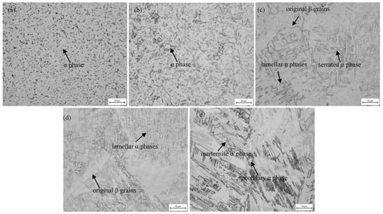 The microstructures of the various microzones within the BM, HAZ, and FZ are shown in Figure 3, corresponding precisely to the marked positions in Figure 2. As shown in Figure 3a, the Ti-4Al-2V titanium alloy base metal is composed of equiaxed grains at the α phase. In Figure 3b, the microstructure adjacent to the BM, namely, the incomplete recrystallization zone of the HAZ, exhibits notable growth and deformation of the equiaxed α grains, attributable to the influence of the welding heat. This region is less affected by the welding heat and the temperature is below the phase transition temperature, thus causing the grain to increase without a transition of phases. Figure 3c shows that the recrystallization zone of the HAZ is a basket-weave microstructure. Here, the original β grains exhibit irregular shapes, with lamellar α phases and serrated α structures crisscrossing within the grains [26]. In Figure 3d, the microstructure of the superheated zone of the HAZ, characterized by a Widmanstätten structure, is displayed. This zone experiences the highest temperatures within the entire HAZ, exceeding the β transition temperature and approaching the melting point [27]. Specifically, the microstructure reveals distinct features: the grain boundaries of the coarse primary β grains are clear and complete, and there is a grain boundary α phase around the primary β grains. Within these β grains, a larger and parallel flake α phase is observable.