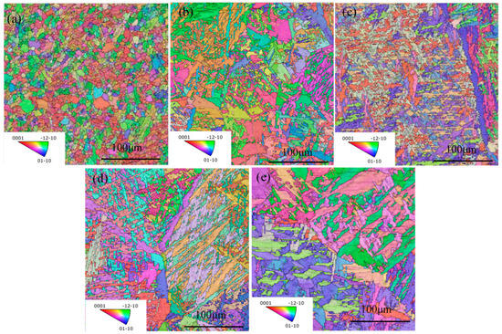 IPF of welded joint: (a) BM, (b) HAZ–incomplete recrystallization zone, (c) HAZ–recrystallization zone, (d) HAZ–superheated zone, and (e) FZ.