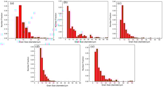 Figure 4 shows the inverse pole figure (IPF) of various microzones within the welded joint, while Figure 5 presents the corresponding grain size distributions. As shown in Figure 4, the equiaxed grains of the Ti-4Al-2V titanium alloy base alloy undergo gradual growth and recrystallization due to the influence of the welding thermal cycles. Figure 5a indicates that the grain size of the base alloy spans a range from 5 μm to 10 μm. A comparative analysis of Figure 4b–d reveals that the grains in the recrystallization zone and the superheated zone exhibit a distinct preferred orientation, whereas the grains in the incomplete recrystallization zone lack a preferred orientation. As depicted in Figure 5b–d, the grain sizes in these three microregions primarily vary from 5 μm to 15 μm. Notably, the proportion of grain sizes smaller than 10 μm is 72.32% in the incomplete recrystallization zone, 65.91% in the recrystallization zone, and 55.14% in the superheated zone. The grain size within the FZ is primarily distributed between 10 μm and 20 μm (Figure 5e), with a 26.09% proportion of grains exhibiting sizes smaller than 10 μm.
