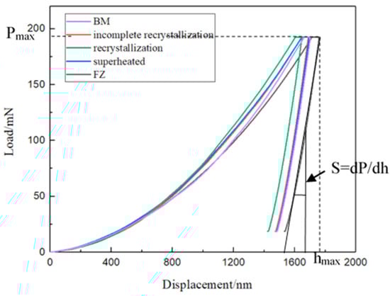 The load–depth curves obtained from the nanoindentation test conducted on the Ti-4Al-2V titanium alloy welded joint are depicted in Figure 6. By employing the load–displacement (p-h) curve fitting approach methodology by Oliver and Pharr, some important empirical equations were obtained to further understand the principle of this technique [19,20,28]. From the p-h curve, three vital quantities can be extracted: the maximum load (Pmax), the maximum displacement (hmax), and the elastic unloading stiffness (S = dp/dh), which is determined from the upper portion of the unloading curve. The hardness (H) and Young’s modulus (E) can be calculated using the following equations [22]: