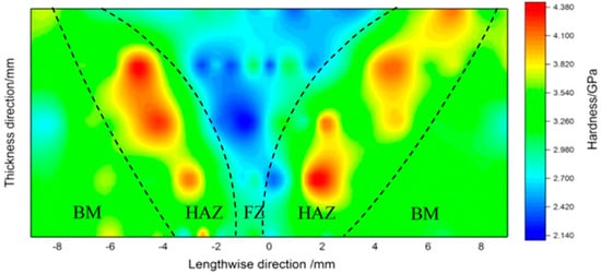 Figure 7 presents a nanohardness cloud image of the welded joint of the Ti-4Al-2V titanium alloy. The results of the Vickers hardness measurement of the welded joint of the Ti-4Al-2V titanium alloy are listed in Table 4. Combined with the test results in Table 3, it can be seen that, compared to the BM, which has a nanohardness of 3.226 GPa, the nanohardness within the HAZ of each microzone exhibits a noticeable increase, whereas a decrease in nanohardness is observed in the FZ. Notably, the nanohardness of the recrystallized zone within the HAZ is the largest, reaching 3.753 GPa. The Vickers hardness measurement results are consistent with the change in nanohardness. Within the HAZ, the hardness of each microzone exceeds that of the BM and the FZ. Notably, the recrystallization zone exhibits the highest hardness value, reaching 298.396 HV. According to Liu et al. [30], the inhomogeneity of the α phase and α’ phase in the HAZ of the TA15 titanium alloy electron beam welding joint has an impact on its nanohardness. Furthermore, Babu et al. [17] demonstrated that the morphology and size of the α phase in the welded joint plays a crucial role in determining the mechanical properties. As shown in Figure 7, the highest nanohardness value is concentrated in the central region of the HAZ, specifically in the recrystallization zone. Referring to Figure 3b, it can be seen that this recrystallization zone primarily consists of a basket-weave microstructure, where the α-phase is uniformly and finely distributed. This fine and uniform α-phase structure is more effective at hindering dislocation movements, thereby enhancing hardening behavior. In contrast, the lowest nanohardness values are observed in the center of the FZ. By analyzing its microstructure in Figure 4e, it becomes clear that the FZ exhibits a coarser grain structure compared to other microregions, which accounts for its lower nanohardness.