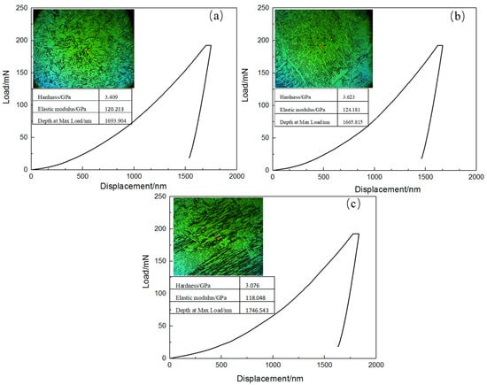 Figure 8 illustrates the nanoindentation load–depth curves that are representative of the microstructures present in the HAZ. Notably, the basket-weave microstructure depicted in Figure 8b exhibits the highest average nanohardness, achieving a value of 3.93 GPa. Additionally, its elastic modulus is also the highest, attaining 125.191 GPa. The nanohardness trend within the HAZ reveals a distinct hierarchy: basket-weave microstructure > fine-grain microstructure > Widmanstätten microstructure. In a previous study on nanohardness across welded structures of high-strength steel, it was observed that the nanohardness of a fine-grain structure exceeded that of a coarse grain structure [23]. Similarly, this finding aligns with the typical nanohardness variation observed in the microstructure of the Ti-6Al-4V titanium alloy welded joint. A basket-weave microstructure is mainly composed of a fine layer structure; its grain size is small and it has high strength and toughness. The basket-weave microstructure, which primarily comprises fine lamellar structures, exhibit high strength and toughness. The nanoindentation studies conducted on the Ti-6Al-4V titanium alloy reveal that the basket-weave microstructure significantly enhances creep resistance and tensile strength [24,32]. Based on these findings, acquiring a basket-weave microstructure during the welding process is expected to result in a titanium alloy welded joint with improved mechanical properties. Therefore, achieving a higher proportion of basket-weave microstructures in the Ti-4Al-2V titanium alloy welded joint is desirable.