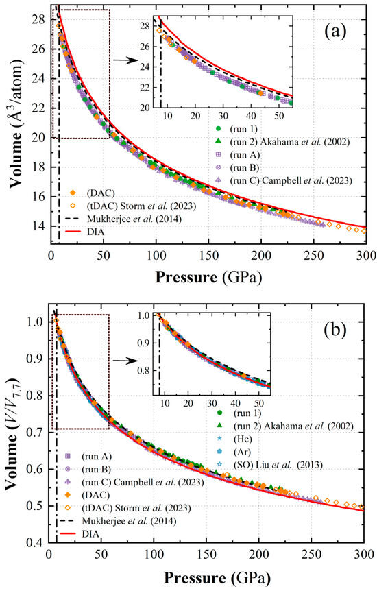 - Dewaele, A.; Loubeyre, P.; Mezouar, M. Equations of state of six metals above 94 GPa. Phys. Rev. B 2004, 70, 094112. [Google Scholar] [CrossRef]
