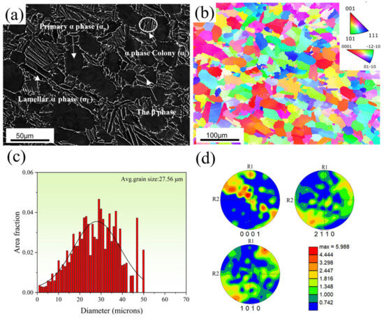 As-received Ti60 alloy microstructure: (a) BSE image; (b) IPF image; (c) grain size figure; (d) PF image of α phase.