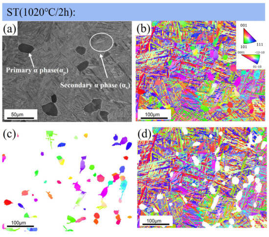 BSE and IPF maps: (a) BSE maps after ST; (b) IPF maps after ST; (c) orientation of the αp grains in (b); (d) orientation of the αs grains in (b).
