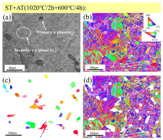 BSE and IPF maps: (a) BSE maps after ST + AT; (b) IPF maps after ST + AT; (c) orientation of the αp grains in (b); (d) orientation of the αs grains in (b).