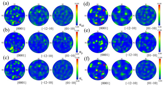 To provide a visual representation of the preferred orientation behavior more intuitively, the textures of αp and αs are depicted using {0 0 0 1}, {−1 2 −1 0}, and {0 1 −1 0} pole figures. The texture of the αp and αs phases after ST treatment of the samples are represented in Figure 5b,c, respectively, while the textures of the αp phase and αs phases after ST + AT treatment of the samples are represented in Figure 5e,f, respectively. Notably, Figure 5c,f reveal a distinct texture composition characterized by a dominant component with higher intensity compared to the overall texture of the α phase depicted in Figure 5a,d. This phenomenon may be due to the absence of αp phases with other orientations. Furthermore, the orientation relationships between αp phase and αs phases in the samples after the two different heat treatments exhibit some differences. For the ST-treated samples, the difference between the αp and αs texture fractions in the {0 0 0 1} polar plots are significant, and this finding is replicated in the samples treated with ST + AT.