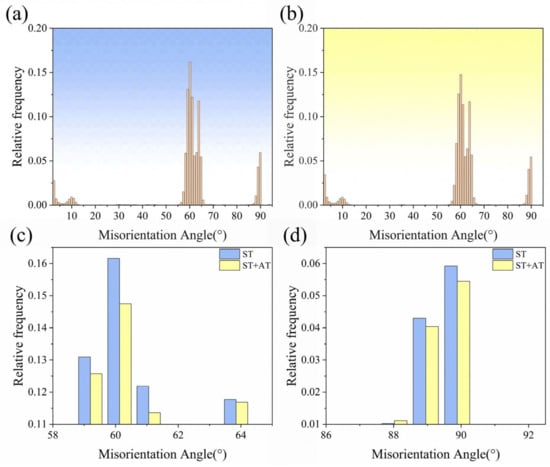 Misorientation angle distribution of αs: (a) ST; (b) ST + AT; (c) distribution of variants around 60° in ST and ST + AT; (d) distribution of variants around 90° in ST and ST + AT.