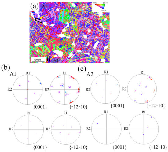 During the phase transition, the difference in the lattice parameters between the two phases results in the accumulation of strain energy, while the formation of interfacial energy is caused by the appearance of the interface between the two phases. Therefore, the preferential nucleation of αs at grain boundaries reduces both the interfacial and strain energies [30], thereby facilitating the selection of specific α variants with preferential nucleation at the grain boundaries. After aging treatment, the α boundaries have lath-shaped nuclei exhibiting a similar orientation bias toward {0 1 −1 0}, as indicated by the black frame in Figure 8a, contributing to the formation of a specific αs texture. The lamellar α phase oriented in the {0 1 −1 0} direction is evident in these two regions, while the lamellar α phase of this orientation is coarsened at the boundary, which can be further concluded using the polar diagrams. Pole figures representing the orientation at the α boundaries in A1/A2 are depicted in Figure 8b,c, illustrating a clear preference for {0 1 −1 0} orientation in both A1 and A2 regions. This tendency may arise from the limited nucleation of new variants during the aging treatment, coupled with the coalescence of grain boundaries into broad α-phase laths over an extended holding time [8,31]. Consequently, these behaviors contribute to the enhanced intensity of the {0 1 −1 0} texture.