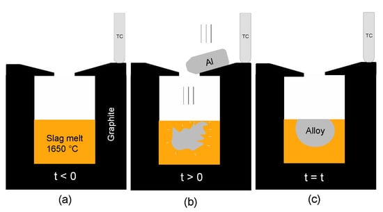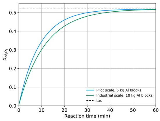 8] fall within the same range as the calculations. The discrepancy between the model’s predictions and experimental results is partly attributed to the kinetic equation’s omission of continuous Al addition. The kinetic equation reflects a global reaction rate, and without accounting for the ongoing addition of Al. The reaction times for pilot and industrial were calculated as 58 min and 73 min for 100% completion and 28 min and 35 min for 95% completion, respectively. The results should be interpreted as indicating the lower bound of the reaction rate. Since the reaction in the slag phase is mass-transfer controlled, vigorous stirring should enhance the rate of mass transfer. Under constant stoichiometry and stirring, these reaction times depend solely on the initial Al surface area. While a larger surface area of inserted Al reduces reaction time, in practice, the energy from the dropped Al can catalyze interfacial phenomena and induce convection, which can influence reaction time. Furthermore, the exothermic nature of the overall reaction may depend on the mass and surface area of the inserted Al metal, as these factors could accelerate the initial reaction rate by locally increasing the temperature at the reaction interface. These effects should be considered in more detail when scaling up.
