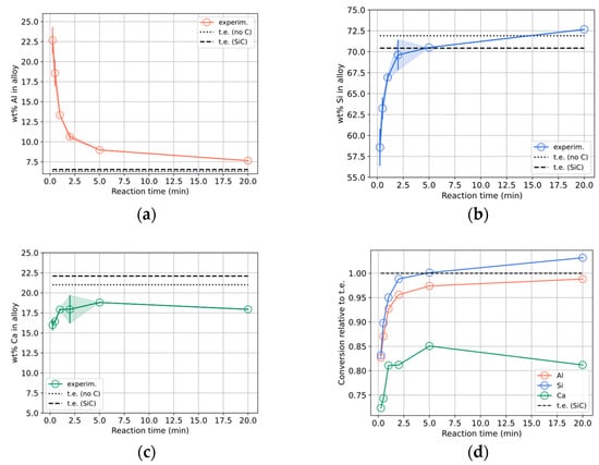For the alloy, the expected conversion degrees relative to t.e. were 72% for Ca and 83% for both Si and Al after just 15 s of reaction time, as illustrated in