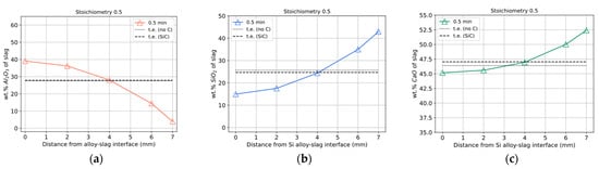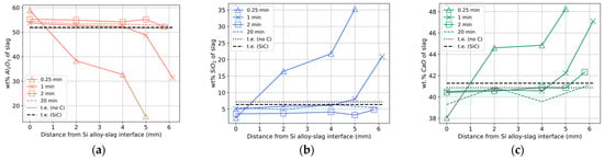 Figure 4a–c. Unlike the relatively homogeneous composition of the alloy, which has an average standard deviation of 1.15 wt.% Al in parallel EDS measurements, the slag shows a gradient perpendicular to the interface. This gradient decreases over time, stabilizing after approximately 2 min, indicating that approximate equilibrium has been reached. The composition of the slag closest to the interface demonstrates a reduction in SiO