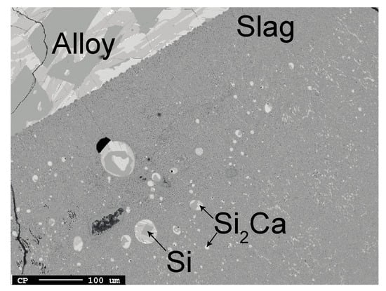 Although the compositional gradient in the slag phase approaches zero after 2 min of reaction time, suggesting the system has reached equilibrium or approximate equilibrium, some alloy droplets mixed in the slag can still be seen, as illustrated in