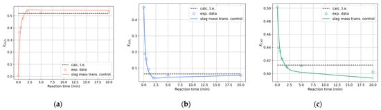 The first-order kinetic equation was applied to describe compositional changes in the slag, while no satisfactory fit was found for the Al content in the alloy. This observation suggests that mass transport in the alloy phase is unlikely to be the limiting factor in the conversion process. Multiple models were considered, including nucleation, diffusion, order-based, and geometrical contraction models. Among these, the first-order, Ginstling–Brounshtein, and spherical contraction models provided the best fit. The first-order kinetic equation was ultimately selected because it yielded the most accurate results, was the simplest to interpret, and is widely used in published studies on liquid metal–slag reactions.