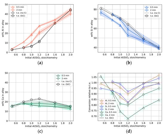 Figure 9d displays the conversion relative to t.e. for alloy components with varying stoichiometries. Deviation from t.e. increases as stoichiometry rises from 0.5 to 1.2, then shifts to decreasing deviation as stoichiometry increases from 1.2 to 2. Ca deviates from t.e. somewhat more than Al and Si, aligning with previous studies on stoichiometries of 1 and 1.2 [