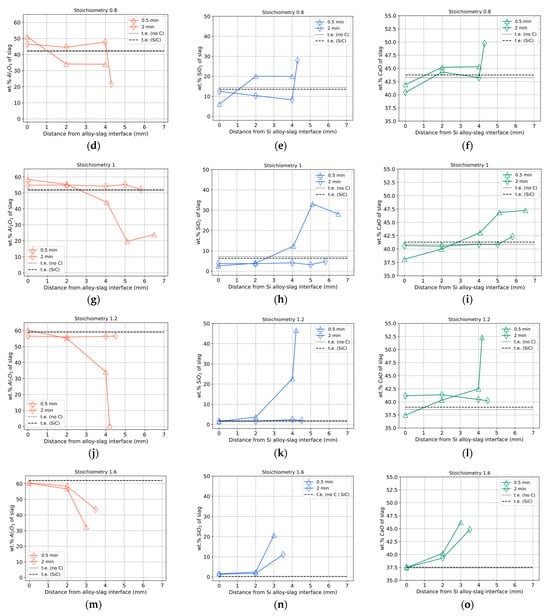 For all stoichiometries, the measured concentration gradients between the alloy–slag interface and the slag bulk indicated time-dependent transport of slag components (Al