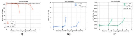 2, and CaO from the alloy–slag interface to the bulk slag for reaction times of 0.5 and 2 min. The lowest conversion relative to t.e. occurred for stoichiometry 1.6, while the highest conversion occurred for stoichiometry 0.8.