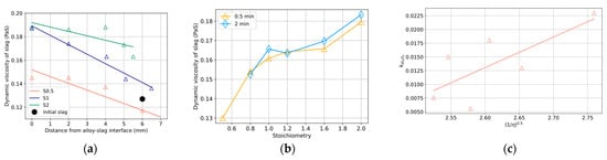 Figure 11a shows the dynamic viscosities at varying distances perpendicular to the alloy–slag interface for some stoichiometries and initial slag viscosity after a reaction time of 0.5 min. The viscosity tends to decrease with distance from the alloy–slag interface to the bulk slag due to the relative increase in Al
