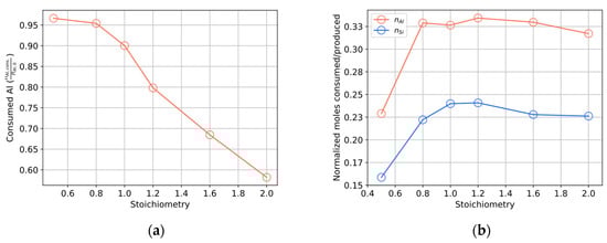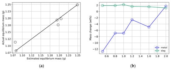 Figure 12a. The deviation from the actual equilibrium mass of the alloy ranged from 0.003% to 2.88%. The highest deviations were observed for stoichiometries 0.5 (−2.88%) and 1.2 (+1.81%) relative to the actual equilibrium alloy mass. This equation was then used to estimate the real mass of the alloy produced in experiments and on larger production scales (